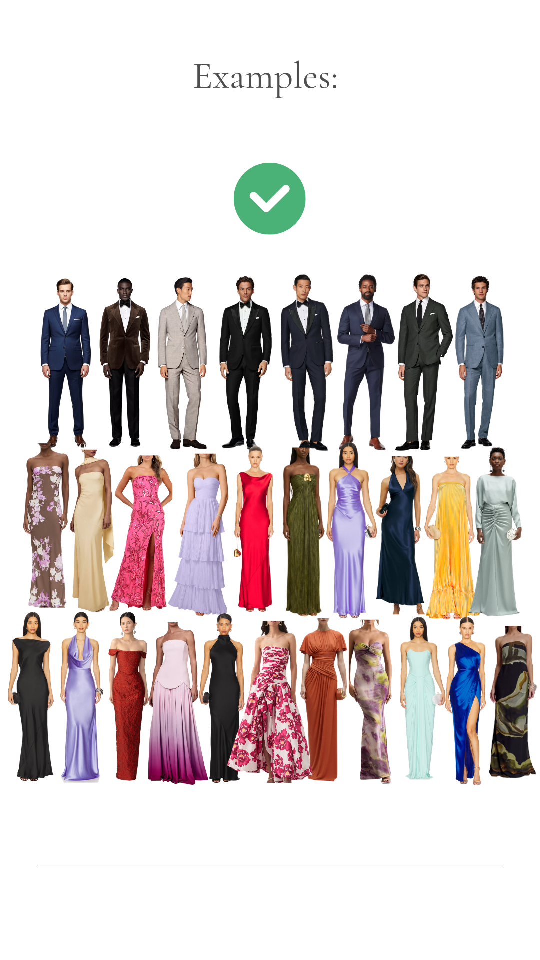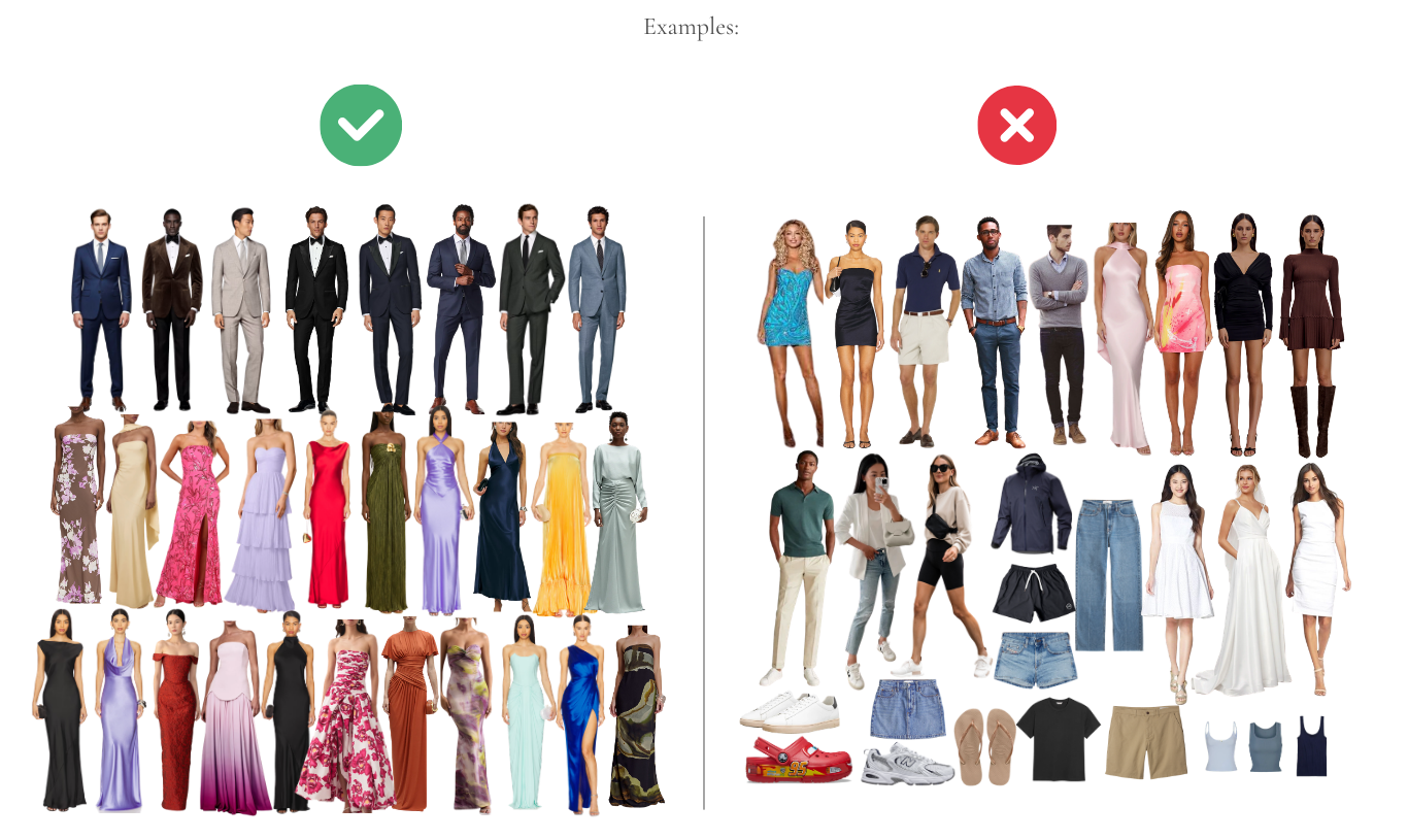 Please refrain from wearing white, ivory, cream, nudes, or baby pink. Thank you for understanding!